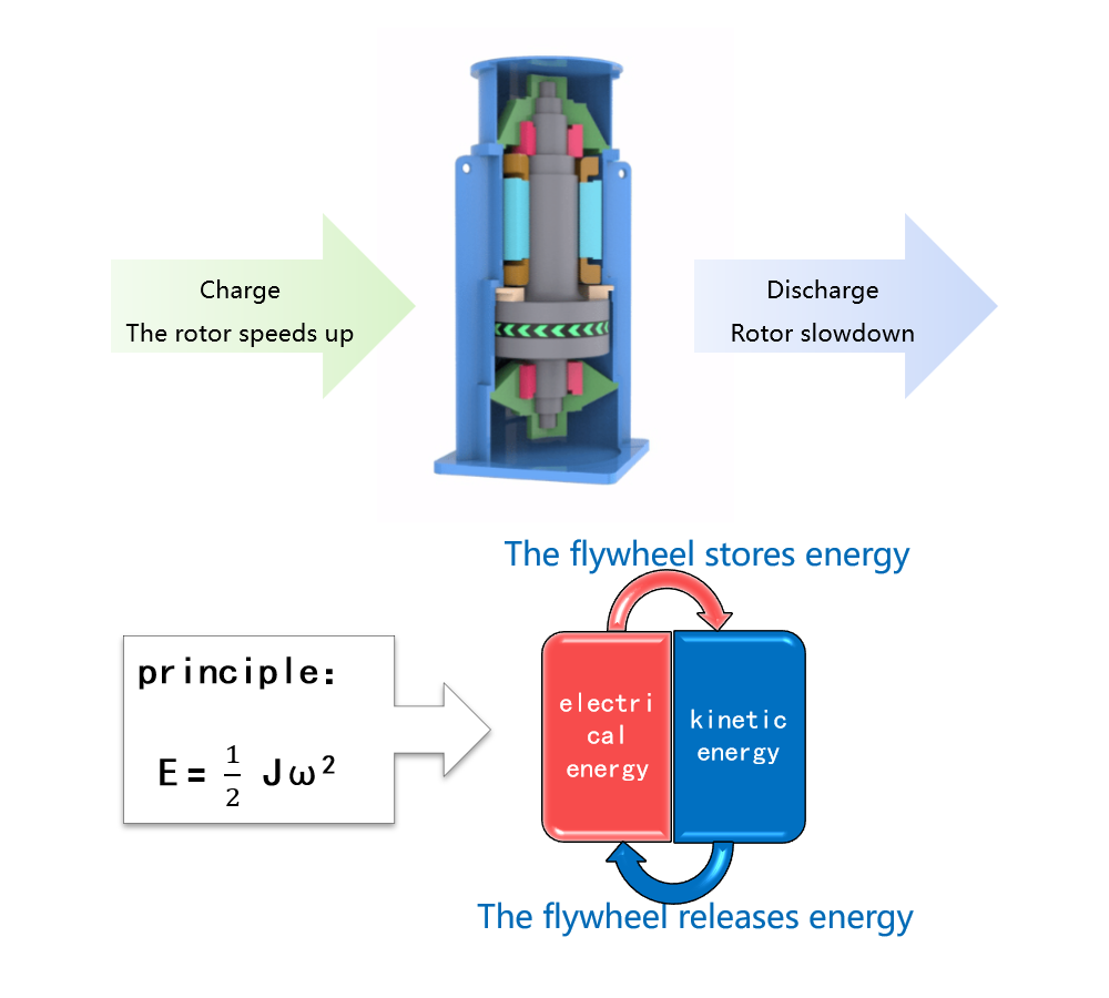 Energy storage and release are achieved through the acceleration and deceleration of the flywheel rotor.